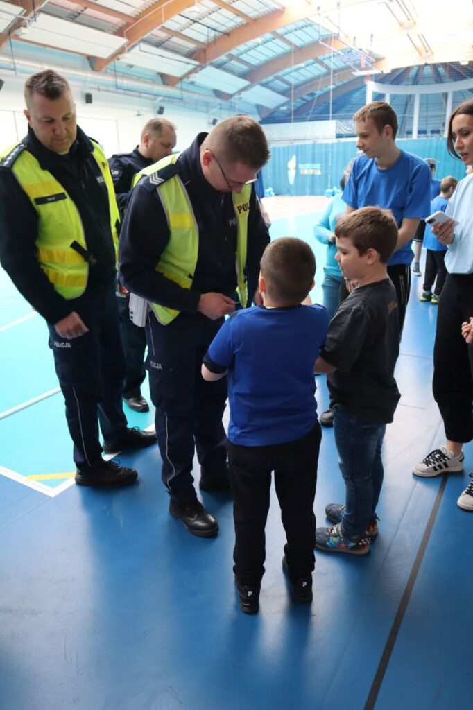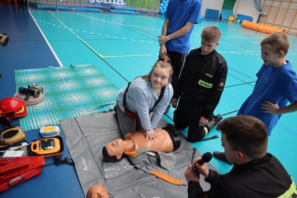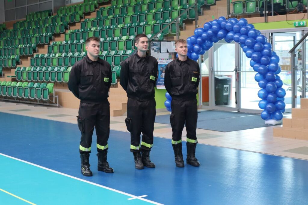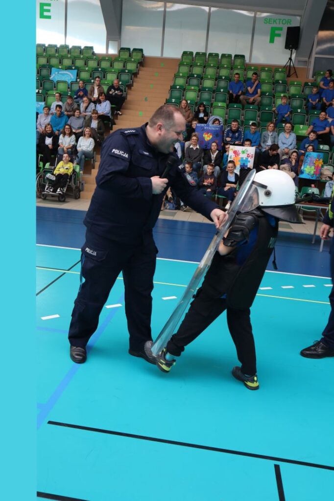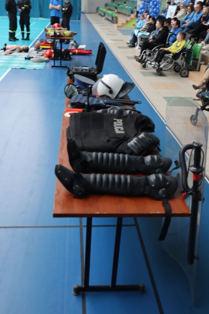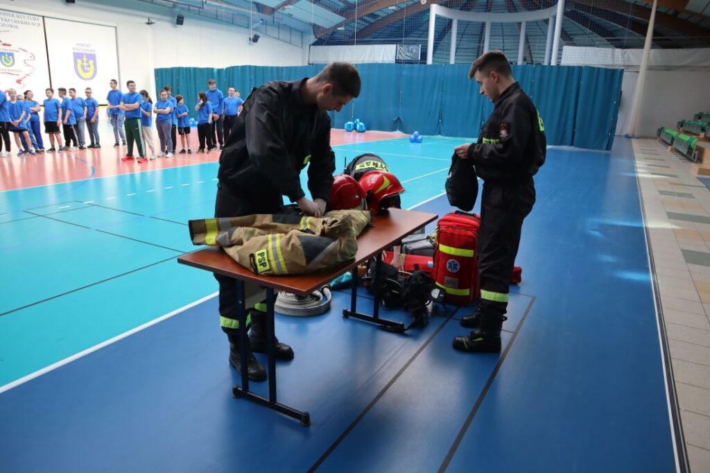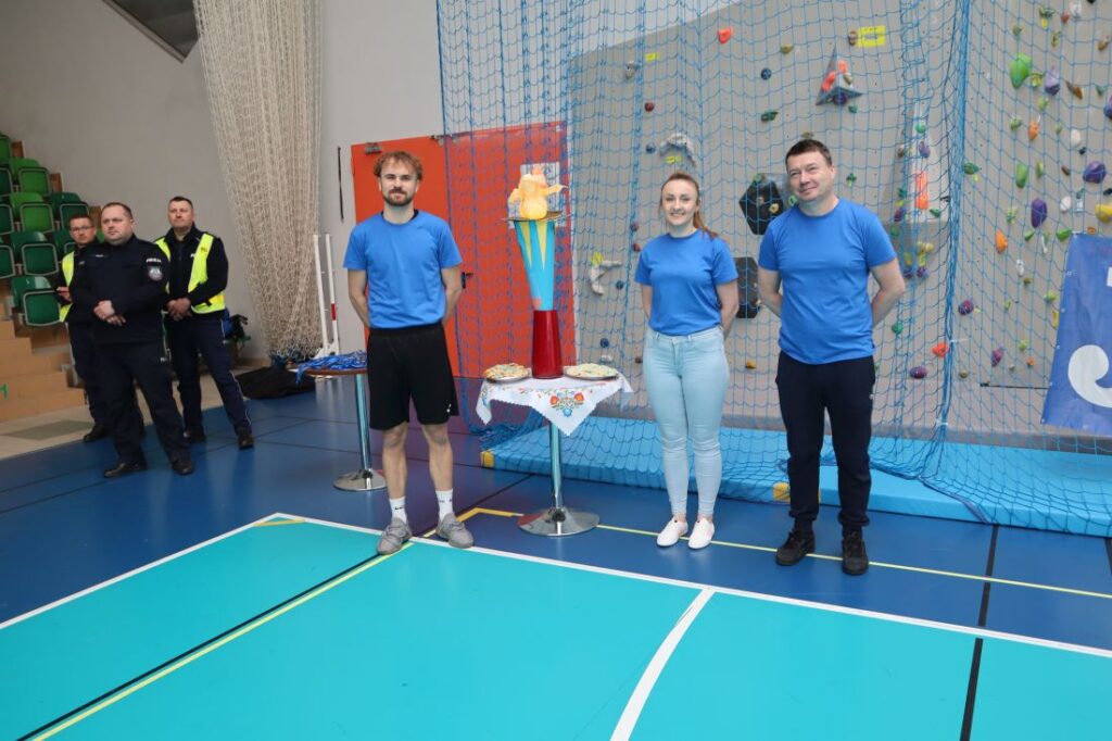 Uroczystość „Niebieskich Igrzysk” rozpoczęła się podniosłym przywitaniem wszystkich uczestników oraz gości. Już na wstępie wydarzeniu nadano wyjątkowy charakter dzięki pokazowi przygotowanemu przez Powiatową Komendę Policji w Pińczowie oraz Państwową Straż Pożarną w Pińczowie. Zaprezentowane działania służb mundurowych przybliżyły ich odpowiedzialną i wymagającą pracę, a także podkreśliły znaczenie umiejętności udzielania pierwszej pomocy przedmedycznej.